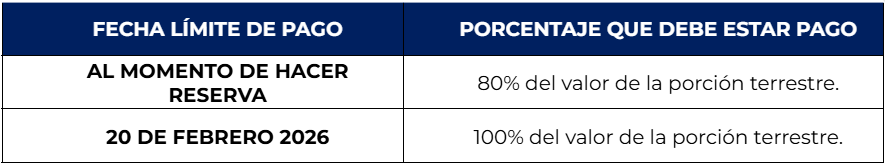 • Después de realizar el pago total o parcial de su reserva, cualquier cambio o cancelación genera penalidad y diferencia de tarifa.