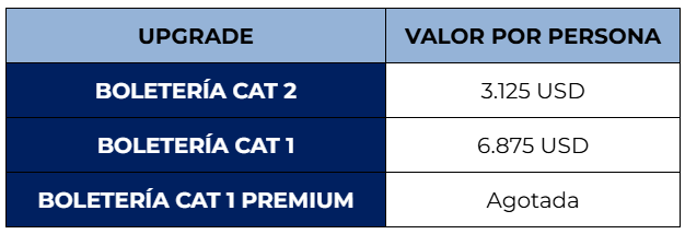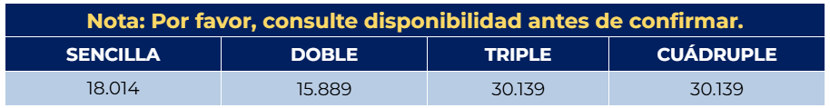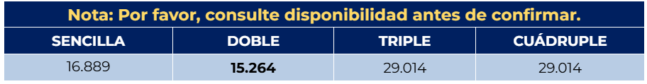 • La confirmación definitiva del programa se realizará únicamente una vez se valide y reconfirme la tarifa y la disponibilidad al momento de la solicitud formal.