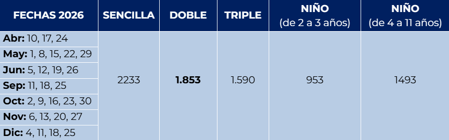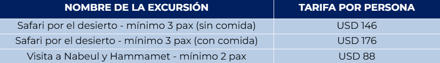 - Las excursiones que incluyen transporte marítimo están sujetas a condiciones meteorológicas.
