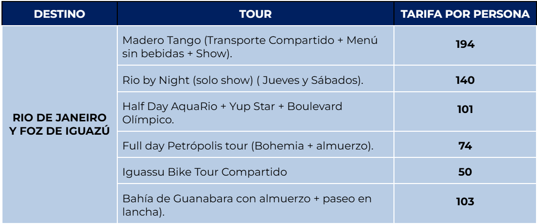 Desayuno. Salida para realizar un tour de día completo a los principales atractivos turísticos de Río de Janeiro, en servicio compartido, incluyendo entradas y almuerzo (sin bebidas).