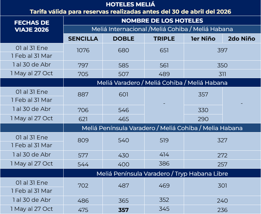 - El pasajero podrá iniciar el programa desde La Habana, siempre que se respeten dos (2) noches de alojamiento en dicha ciudad y tres (3) noches en Varadero.