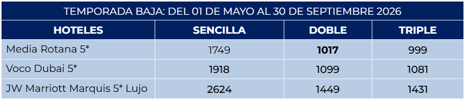 • Dubái Tourism Fee (USD 5 por habitación, por noche).