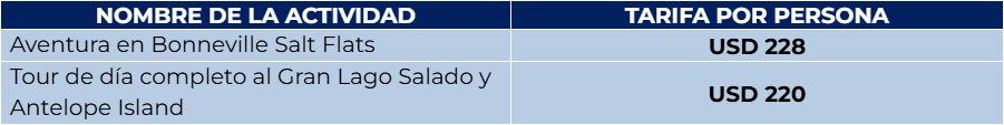 Después del desayuno en el hotel. Se realizará un tour guiado por los principales puntos de interés de Salt Lake City. Visitarás lugares emblemáticos como el Mormon Trail, Temple Square, el Capitolio del Estado, el antiguo fuerte Douglas y los sitios donde se celebraron los Juegos Olímpicos de Invierno de 2002. Durante el recorrido conocerás historias de los pioneros, la religión mormona y datos históricos de la región. Uno de los momentos más destacados será presenciar los 12,000 tubos del órgano del Tabernáculo de Salt lake, famoso en todo el mundo. Alojamiento.
