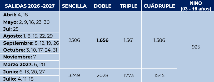 • Precios por persona, referenciales sujetos a disponibilidad y cambio.