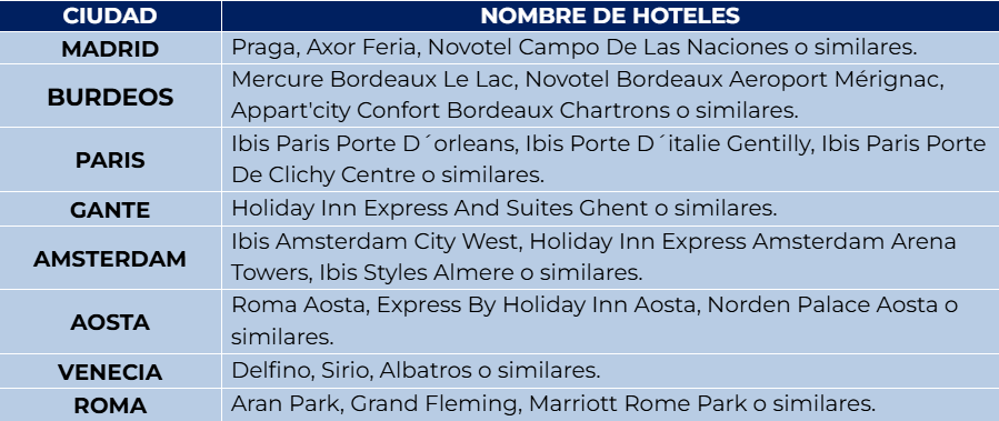 Nota: Debido a la limitada capacidad hotelera del valle, el hospedaje podrá efectuarse en Aosta, Saint-Christophe o Ivrea, localidades próximas.