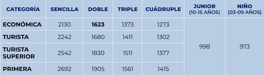 - Si el alojamiento seleccionado incluye desayuno, este se proporcionará diariamente durante la estancia.