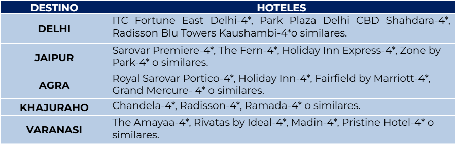 Nota importante: Existe vuelo directo entre Khajuraho y Varanasi durante la temporada operativa comprendida entre noviembre y marzo. En este periodo, el trayecto se realizará en avión en lugar de por carretera. Suplemento aplicable: USD 88 por persona.