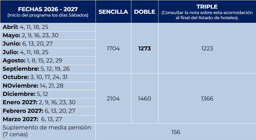 - El orden de las visitas puede sufrir alteraciones, dependiendo de las condiciones del día del tour o de los días festivos nacionales, sin perjuicio alguno para el programa de los pasajeros.