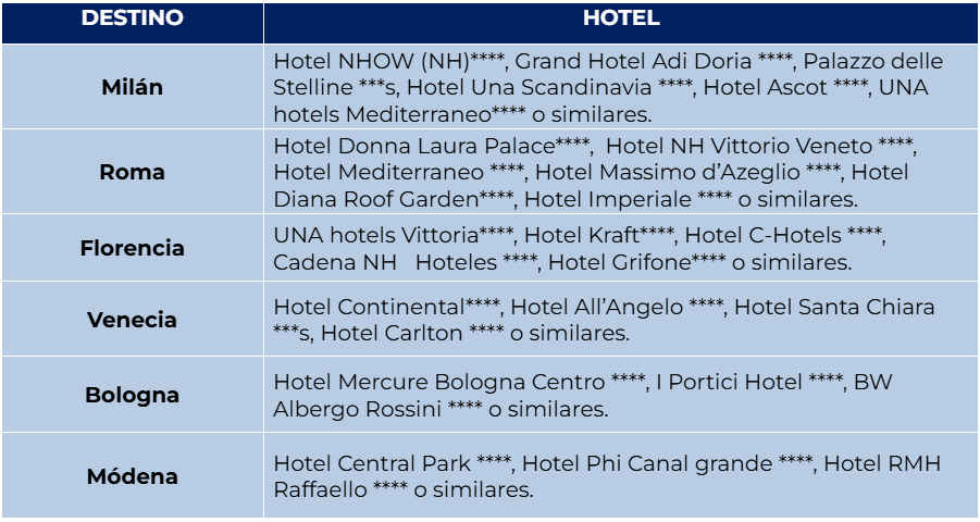 Desayuno en el hotel. Traslado a la estación de trenes de Módena para tomar el tren con destino a la ciudad elegida (Milán, Venecia, Florencia o Roma). A la llegada, traslado al hotel correspondiente.