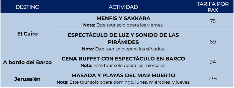 Tarde libre. Podrás realizar una excursión opcional a la Necrópolis de Sakkara y a Menfis, antigua capital del Imperio Antiguo. Por la noche, también de forma opcional, te invitamos a disfrutar del Espectáculo de Luz y Sonido en las Pirámides, una experiencia única bajo las estrellas. Alojamiento