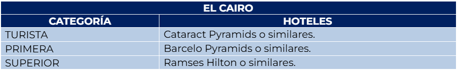 A la llegada al aeropuerto de El Cairo, nuestro representante de habla hispana te estará esperando para brindarte asistencia personalizada. Posteriormente, se realizará el traslado al hotel. Alojamiento.