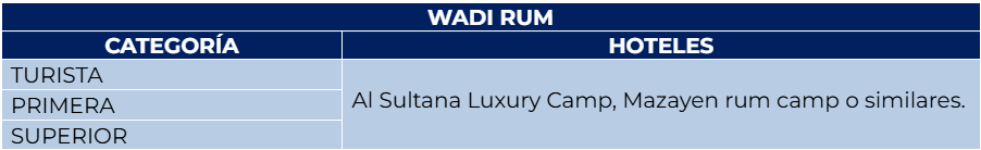 Regreso al hotel y a la hora prevista salida hacia el punto fronterizo donde dejaremos Egipto. Llegada a Arava, vía Eilat, traslado a la frontera de Jordania. Entrada a Jordania, después de la finalización de los trámites de inmigración. Continuación hacia Wadi Rum. Cena (Incluida) y alojamiento.