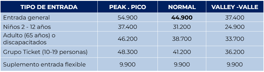 Peak.Pico: Es la entrada premium, con el precio más alto, que ofrece los mejores beneficios. Esto podría incluir acceso a zonas exclusivas, la mejor vista o atención preferencial.