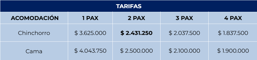 La jornada incluye desayuno en ranchería Wayuu, almuerzo y cena, traslados terrestres, entradas, recorridos guiados y el acompañamiento permanente durante toda la experiencia. El día culmina con alojamiento típico Wayuu, en chinchorros o habitaciones tradicionales, permitiendo una inmersión auténtica en la cultura local y cerrando una jornada inolvidable de conexión cultural, natural y espiritual en La Guajira.