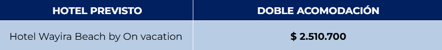 A su llegada al aeropuerto o terminal, recibimiento y traslado hacia el Hotel Wayira Beach, un exclusivo resort ubicado frente a las paradisíacas playas de Mayapo, en el departamento de La Guajira, donde el desierto se encuentra con el mar Caribe. Este hotel ofrece una experiencia de descanso y conexión cultural inspirada en la tradición del pueblo Wayuu, combinando arquitectura y decoración con elementos artesanales propios de la región. Alojamiento.