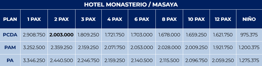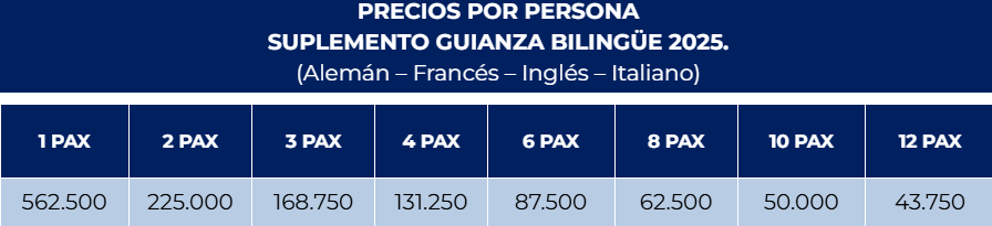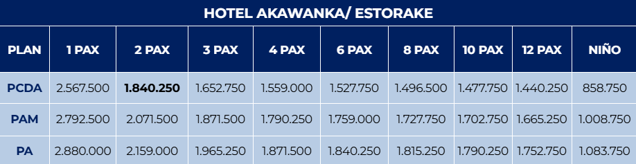 • Entre el 20 y el 31 de diciembre se aplicará un suplemento adicional correspondiente a la temporada alta.