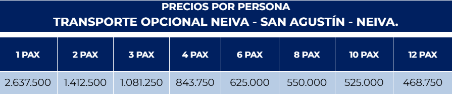 • Transporte privado durante 3 días: Neiva – Zona arqueológica de San Agustín – Neiva.