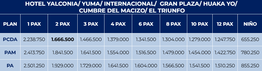 • Las entidades gubernamentales o administrativas nacionales podrán imponer a los planes de viajes o servicios, nuevos impuestos, tasas, contribuciones u otros cargos adicionales, los cuales pueden no estar contemplados en el momento de la venta o pago total de los servicios turísticos y que deberán ser pagos directamente por los usuarios.