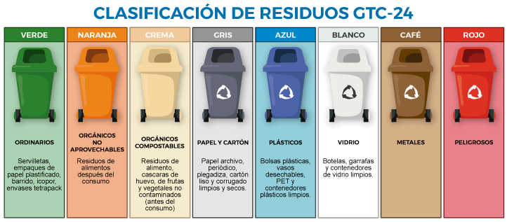 Existe la Guía Técnica Colombia 24 – GTC 24 en donde se indica acorde a los colores cómo se deben clasificar los residuos: